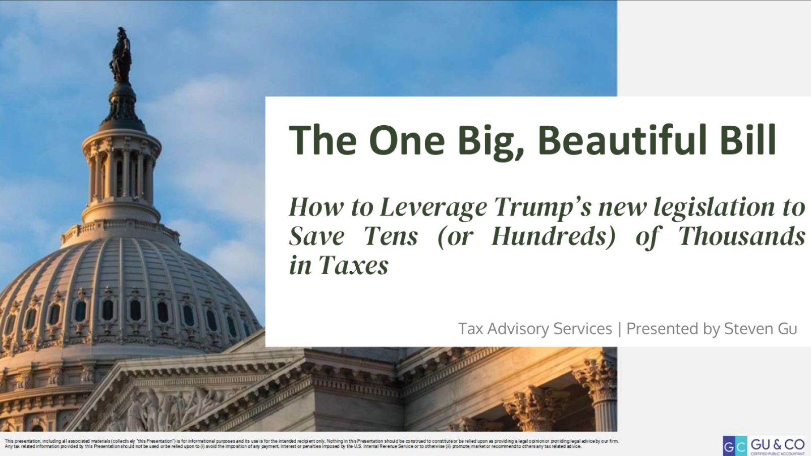 On July 31, 2025, CLI hosted a special seminar featuring guest speaker Steven Gu, who shared expert insights on the newly passed “One Big, Beautiful Bill” and its wide-ranging tax-saving opportunities. Covering permanent tax rate relief, higher standard deductions, business expense advantages, health and medical savings strategies, and energy credit changes, Steven explained how individuals and businesses can leverage this legislation to save tens — or even hundreds — of thousands of dollars. We’re pleased to share highlights from this session, which may prove valuable for our investor community.