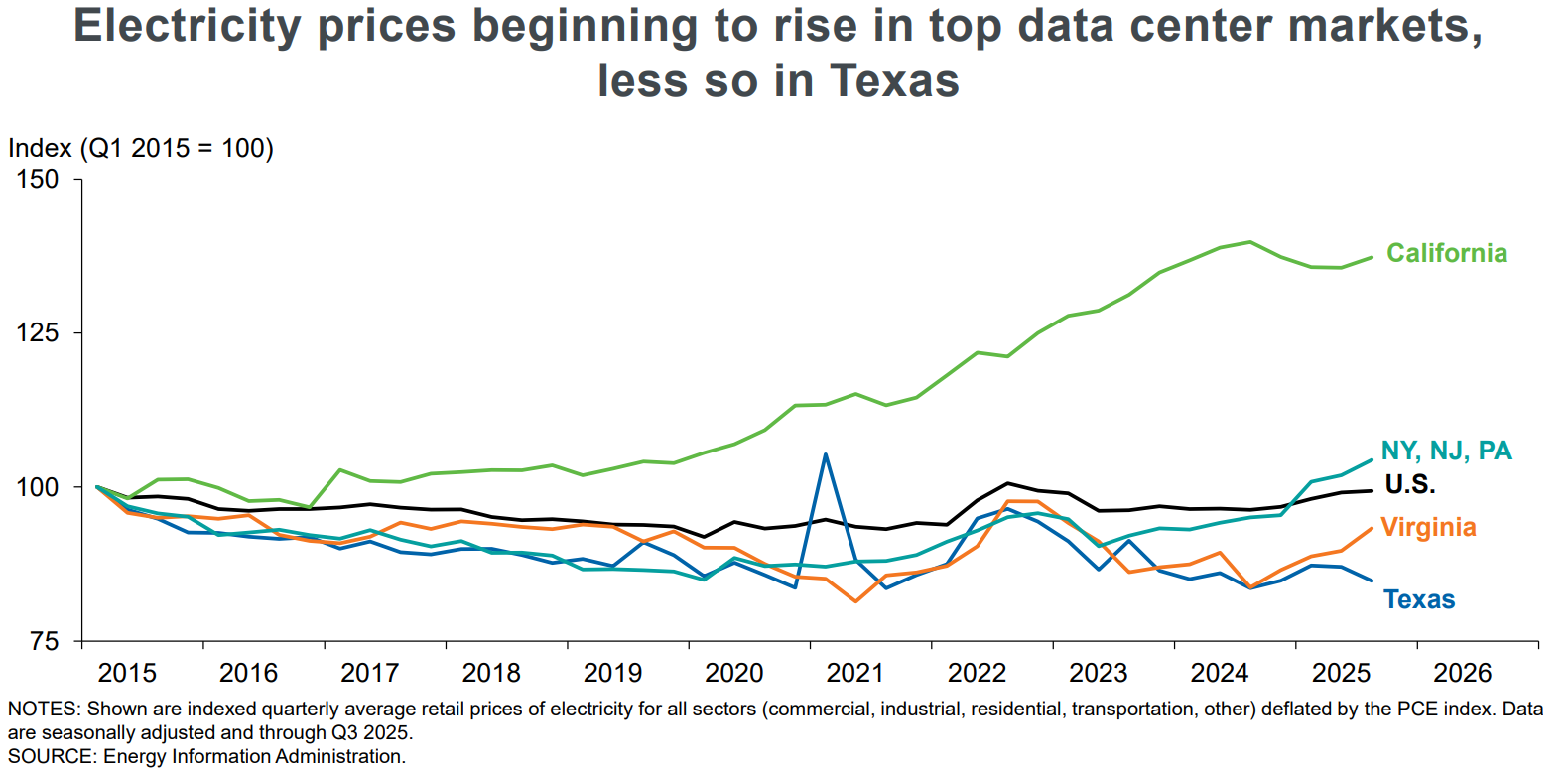 Competitive Cost Advantage: Even as power demands soar, Texas maintains a significant electricity price advantage over other tech hubs like California and Virginia. This "energy delta" continues to attract heavy-industrial and tech firms looking to escape the rising operational costs of the East and West Coasts.