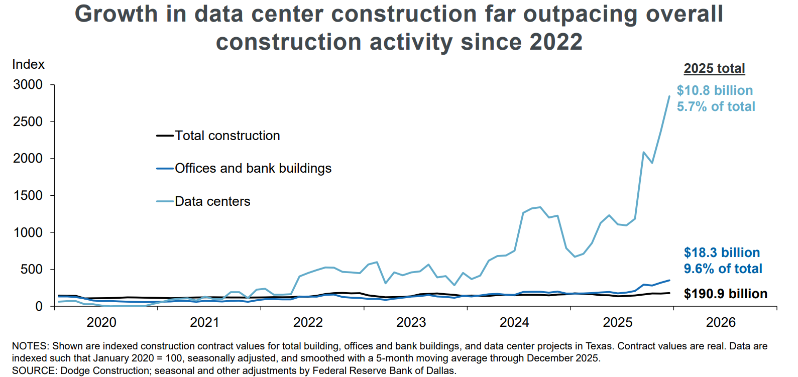 The High-Tech Infrastructure Pivot: Texas has decoupled from the national trend in office construction. Instead, it has pivoted to become the nation's second-largest data center market. Fueled by the AI boom, data center investment in Texas surged to $18.3 billion in 2025, representing nearly 10% of all construction value in the state.