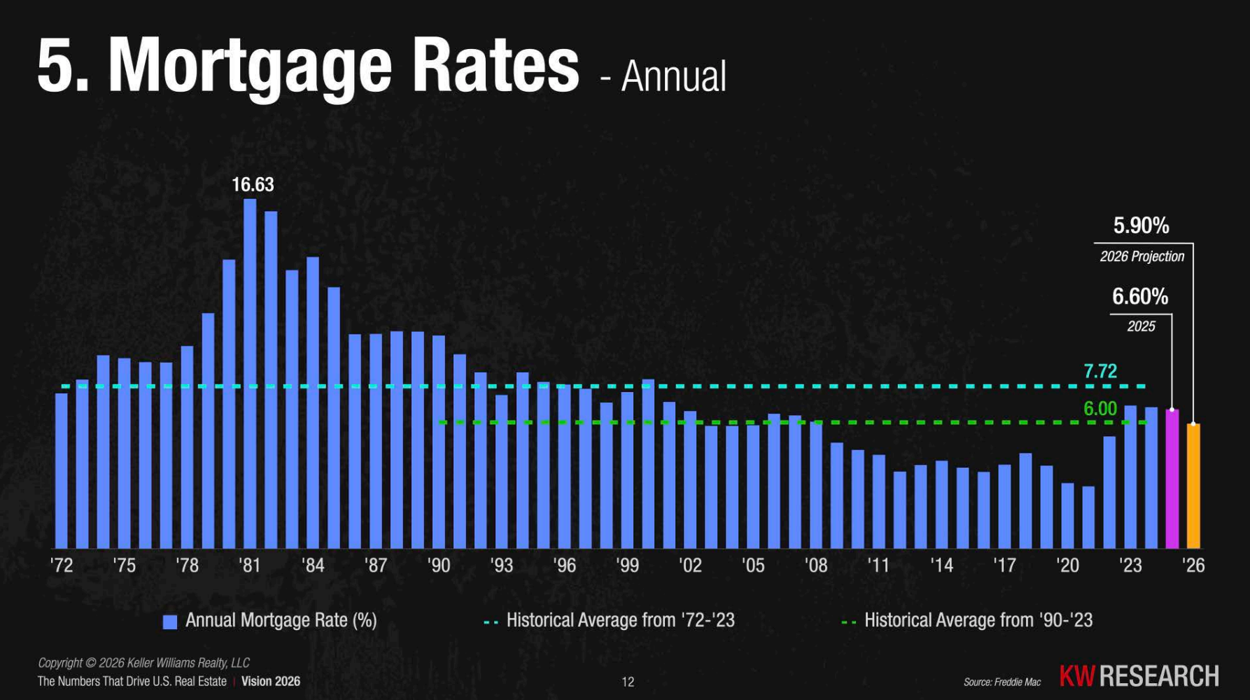 Mortgage rates continue to play a central role in shaping housing demand. After reaching historic lows near 2.7% in 2021, mortgage rates rose sharply and exceeded 7% in 2023. Current projections suggest mortgage rates may stabilize closer to the mid-5% to low-6% range over time.